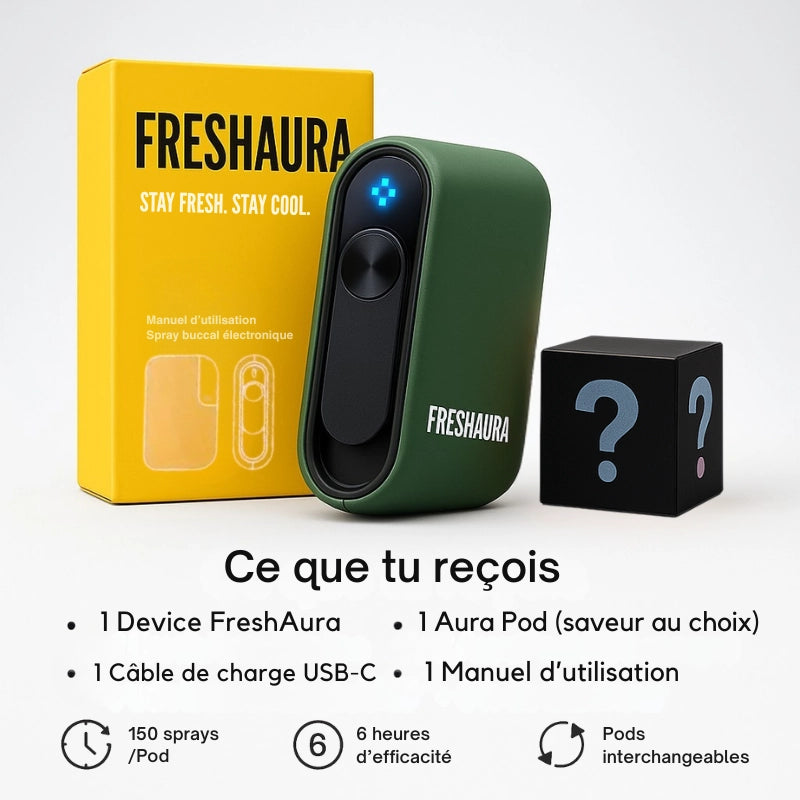 FreshAura utilise des recharges (Aura Pods) interchangeables. Chaque Pod contient 150 vaporisations. Quand il est vide, tu remplaces simplement la recharge : le device, lui, dure dans le temps.