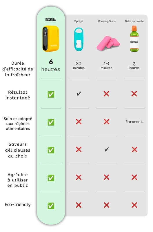 FreshAura agit sur la cause des odeurs (les bactéries buccales), pas seulement sur le parfum.