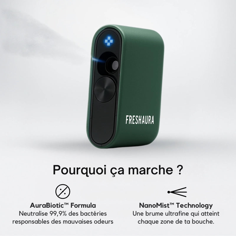La mauvaise haleine provient en grande partie des bactéries présentes sur la langue et les muqueuses. FreshAura agit directement sur ces bactéries pour neutraliser les odeurs à la source — pas seulement les masquer.